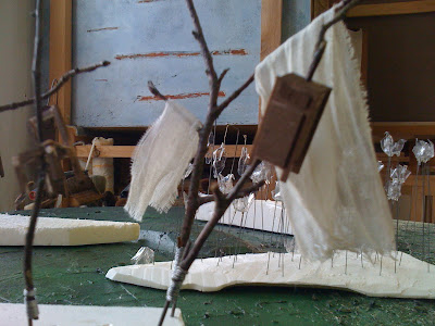 La première étape pour concevoir le storyboard, c'est la maquette. Trouver l'échelle qui permet les vues d'ensemble sans tomber dans le minuscule. Trouver les bonnes matières qui permettent de faire une idée de la plastique en milieu naturel. Après deux jours d'immersion dans l'atelier de Thierry, les choses se clarifient. C'est pas fini mais voici quelques photos de travail pour se faire une idée. Michael.